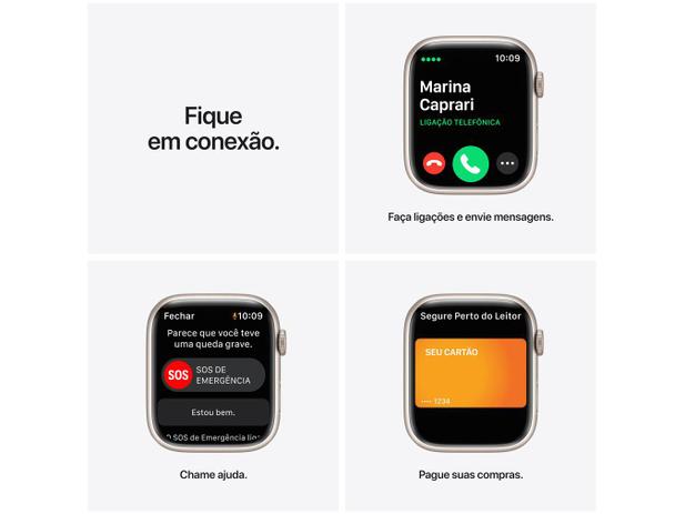 · Mantém você em conexão com sua família e outras pessoas por chamada, mensagem de texto e e-mail sem precisar do telefone por perto****** · Faz streaming de músicas e podcasts onde você estiver, mesmo se deixar o telefone em casa****** · Tela Retina Sempre Ativa com quase 20% mais área de tela do que o Series 6, para deixar tudo mais fácil de ler e acessar · A tela de cristal mais resistente a rachaduras em um Apple Watch, com classificação IP6X de resistência à poeira e ideal para nadar*** · Mostra o nível de oxigênio no sangue com um sensor e app poderosos* · Gera um ECG quando e onde você quiser** · Envia notificações de frequência cardíaca alta e baixa e de ritmo cardíaco irregular**** · Ajuda você a focar no momento presente com o app Atenção Plena e a alcançar suas metas de descanso com o app Sono · Registra os novos treinos de Tai Chi e Pilates, além de outras modalidades populares, como corrida, ioga, natação e dança · Acompanha sua atividade diária e mostra suas tendências no app Fitness no iPhone · Sincroniza e faz streaming de músicas e podcasts · Permite fazer pagamentos na hora e com segurança direto do pulso com o Apple Pay · Bateria para o dia todo e recarga mais rápida***** · watchOS 8, com novas modalidades de treino, o app Atenção Plena, o inédito mostrador Retratos e inovações no Mensagens Avisos legais do Apple Watch Series 7 O Apple Watch Series 7 requer iPhone 6s ou posterior com iOS 15 ou posterior. *O app Oxigênio no Sangue não se destina ao uso médico, incluindo autodiagnóstico ou consulta médica, e foi desenvolvido apenas para fins de bem-estar e boa forma. **O app ECG está disponível no Apple Watch Series 4 e posterior (exceto no Apple Watch SE) com a versão mais recente do iOS e do watchOS. Consulte apple.com/br/watch para obter informações sobre compatibilidade. O uso do app ECG não é recomendado para menores de 22 anos de idade. Com o app ECG, o Apple Watch consegue gerar um eletrocardiograma de derivação única. ***O Apple Watch Series 7, o Apple Watch SE e o Apple Watch Series 3 têm classificação de 50 metros de resistência à água segundo a norma ISO 22810:2010. Isso significa que podem ser usados para atividades aquáticas em pouca profundidade, como nadar em uma piscina ou no mar. No entanto, não devem ser usados para mergulho, esqui aquático ou outras atividades que envolvam velocidade na água ou submersão mais profunda. O Series 7 também tem classificação IP6X de resistência à poeira. ****A notificação de ritmo cardíaco irregular requer a versão mais recente do watchOS e do iOS. Ela não é recomendada para menores de 22 anos de idade nem para pessoas que já foram diagnosticadas com fibrilação atrial. *****Os testes de bateria para o dia todo do Apple Watch foram conduzidos pela Apple em agosto de 2021 usando unidades em pré-produção do Apple Watch Series 7 (GPS) e do Apple Watch Series 7 (GPS + Cellular), cada uma delas emparelhada com um iPhone. Todos os aparelhos foram testados com software em versão preliminar. A duração da bateria varia de acordo com o uso, a cobertura da rede celular, a configuração e muitos outros fatores. Os resultados reais podem variar. Consulte apple.com/br/batteries e apple.com/br/watch/battery.html para obter mais informações. ******O serviço de rede celular requer um plano de dados sem fio. Entre em contato com sua operadora para obter mais informações. A conexão pode variar de acordo com a disponibilidade da rede. Roaming internacional não disponível. Consulte as operadoras compatíveis e os requisitos em apple.com/br/watch/cellular. Acesse support.apple.com/pt-br/HT207578 para ver outras instruções de configuração. |