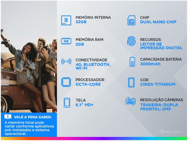 | Tenha um smartphone com desempenho super responsivo em suas mãos! O Moto E6i permite que você capture tudo, pois oferece um conjunto de câmera dupla na parte de trás, deixando que sejam feitas desde fotos em alta resolução até fotos nítidas em situações de pouca luz. Faça selfies ainda melhores para compartilhar nas redes sociais, através da câmera frontal de 5MP. Sua tela de 6,1″ Max Vision conta com resolução HD+ para garantir uma visualização de tirar o fôlego ao assistir seus conteúdos favoritos. Tem 32GB de armazenamento interno, ele é ideal para guardar suas fotos, músicas ou vídeos! E se mesmo assim achar pouco, você pode usar um cartão MicroSD de até 128GB para aumentar essa capacidade. Este produto tem um processador Octa-Core e 2GB de memória RAM, que responde de maneira instantânea, desde navegação na Internet à jogos e vídeos. Fique sempre conectado com a tecnologia 4G em um aparelho dual chip! Tenha bateria para o dia todo, afinal estamos falando de 3000mAh, além de contar com carregamento rápido de 10W. Esse celular entrega proteção personalizada com leitor de impressão digital, deixando seus conteúdos e dados confidenciais protegidos. A cor Cinza Titanium destaca o design do smartphone, garantindo maior elegância em suas mãos. |